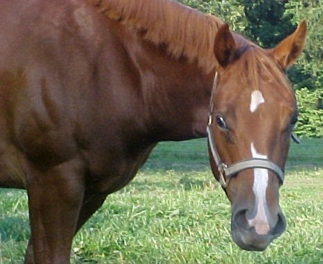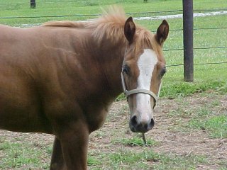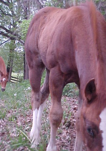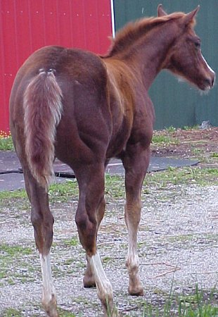 Bella has 3 white socks and a wide white blaze, her dam's huge doe eye, her sire's little sculptured dish face and his big hind quarters.